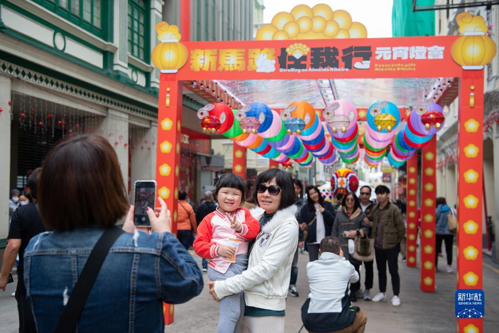 2月4日,市民在澳门新马路拍照合影。新华社记者 张金加 摄