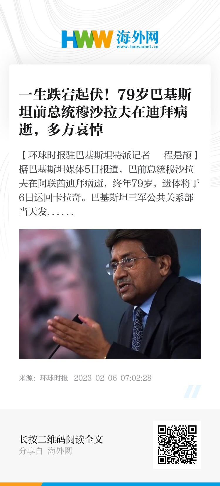 【环球时报驻巴基斯坦特派记者 程是颉】据巴基斯坦媒体5日报道,巴前总统穆沙拉夫在阿联酋迪拜病逝,终年79岁,遗体将于6日运回卡拉奇。巴基斯坦三军公共关系部当天发消息,对穆沙拉夫去世表示遗憾。“德国之声”评论称,穆沙拉夫长期患有罕见的淀粉样变性病,“这位巴基斯坦军事强人经历了从一国之首到一度因叛国罪被判死刑的人生起伏”。