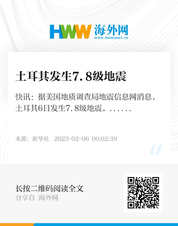 新华社快讯:据美国地质调查局地震信息网消息,土耳其6日发生7.8级地震。