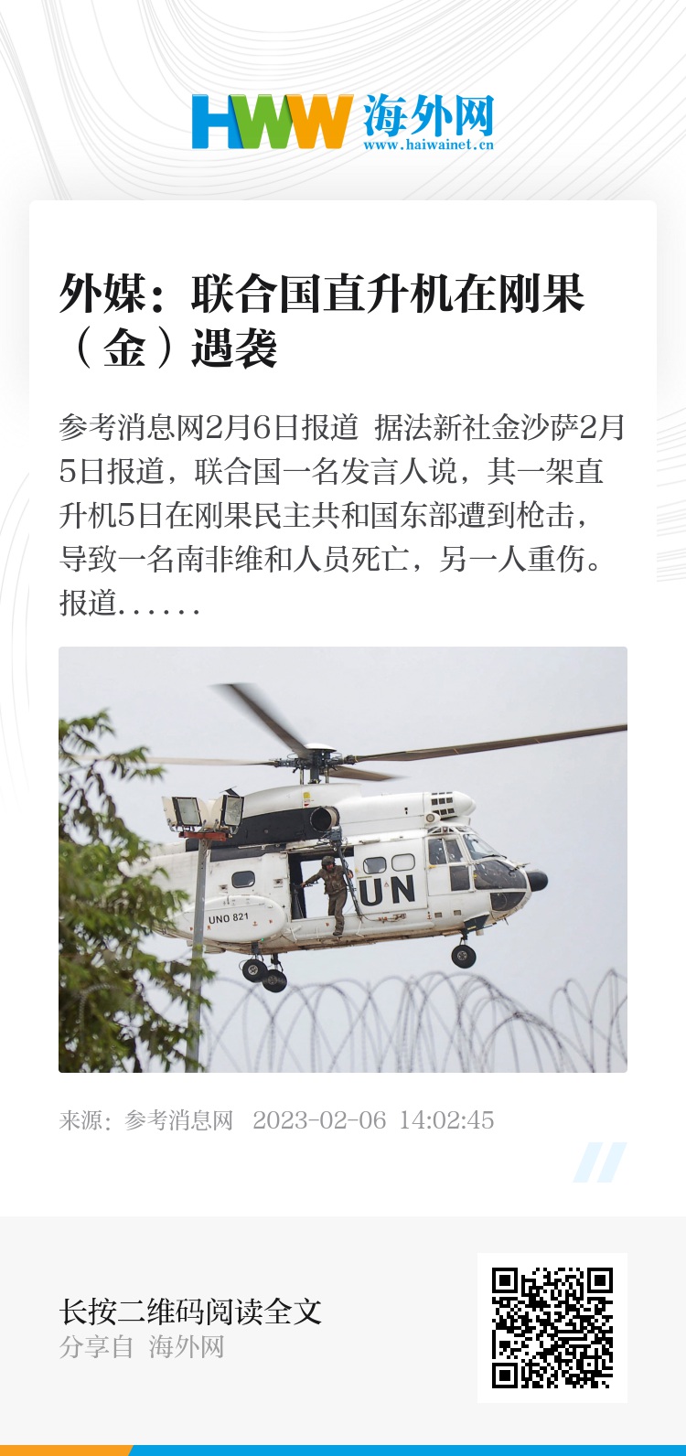 参考消息网2月6日报道 据法新社金沙萨2月5日报道,联合国一名发言人说,其一架直升机5日在刚果民主共和国东部遭到枪击,导致一名南非维和人员死亡,另一人重伤。
