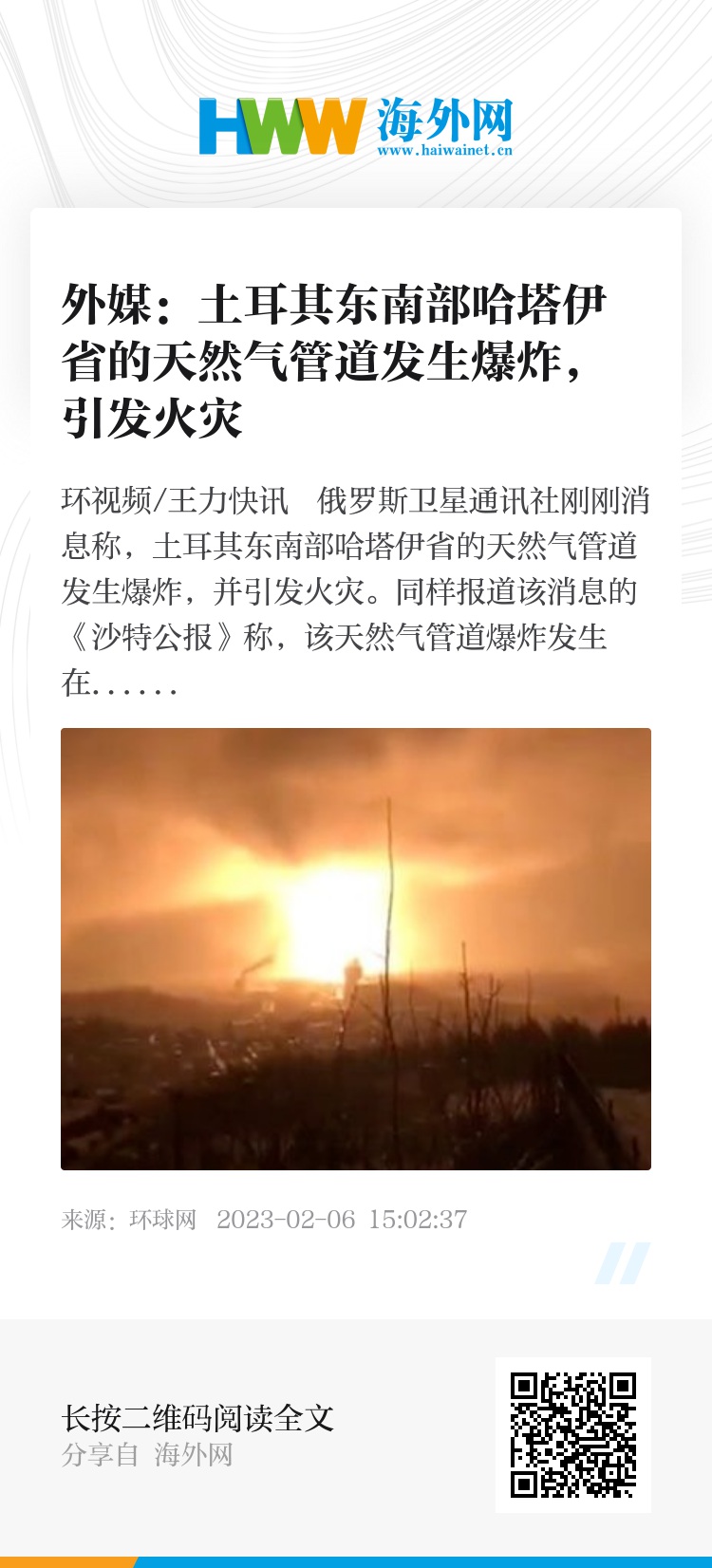 环球网快讯 俄罗斯卫星通讯社刚刚消息称,土耳其东南部哈塔伊省的天然气管道发生爆炸,并引发火灾。同样报道该消息的《沙特公报》称,该天然气管道爆炸发生在土耳其7.8级地震后。外界有猜测认为这一事件与地震有关,但尚未得到官方证实。