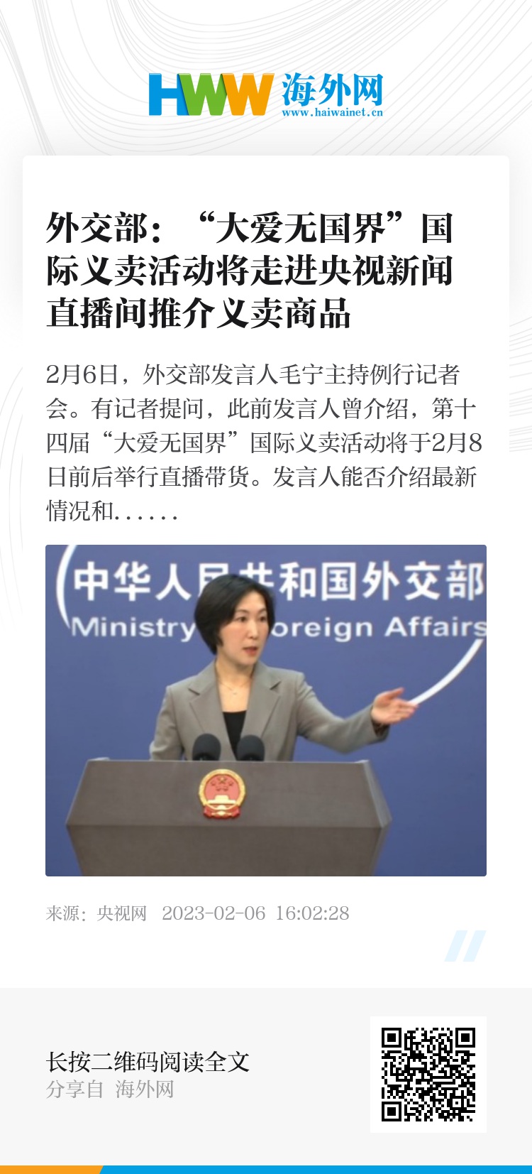 毛宁说,在中外各方的关心支持下,1月17日第十四届“大爱无国界”国际义卖活动开幕式以线上方式成功举办。2月8日晚7点30分将举行直播带货,部分外国驻华使节和高级外交官,外交部定点帮扶的云南省两县,建立支持合作关系的河北省两县代表,将走进央视新闻客户端和淘宝“央视新闻”直播间,推介义卖商品,展示多彩文化。