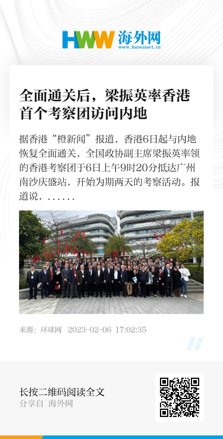 据香港“橙新闻”报道,香港6日起与内地恢复全面通关,全国政协副主席梁振英率领的香港考察团于6日上午9时20分抵达广州南沙庆盛站,开始为期两天的考察活动。报道说,这是香港与内地恢复全面通关后,首个访问内地的香港考察团。