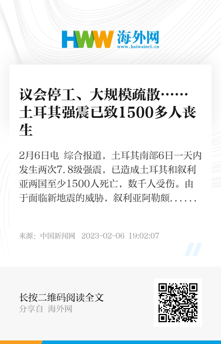 中新网2月6日电 综合报道,土耳其南部6日一天内发生两次7.8级强震,已造成土耳其和叙利亚两国至少1500人死亡,数千人受伤。由于面临新地震的威胁,叙利亚阿勒颇省东部地区开始大规模疏散。