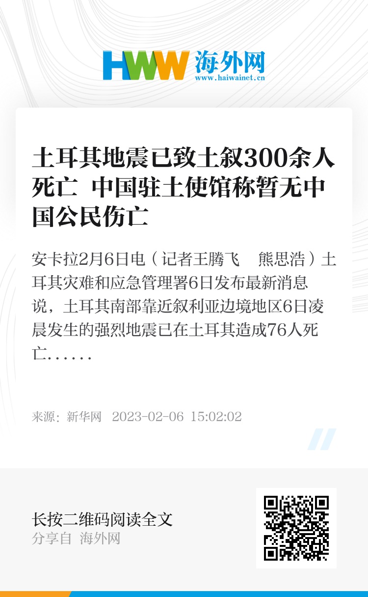 新华社安卡拉2月6日电(记者王腾飞 熊思浩)土耳其灾难和应急管理署6日发布最新消息说,土耳其南部靠近叙利亚边境地区6日凌晨发生的强烈地震已在土耳其造成76人死亡、440人受伤。中国驻土耳其大使馆向新华社记者确认,目前暂无在土中国公民在地震中伤亡。