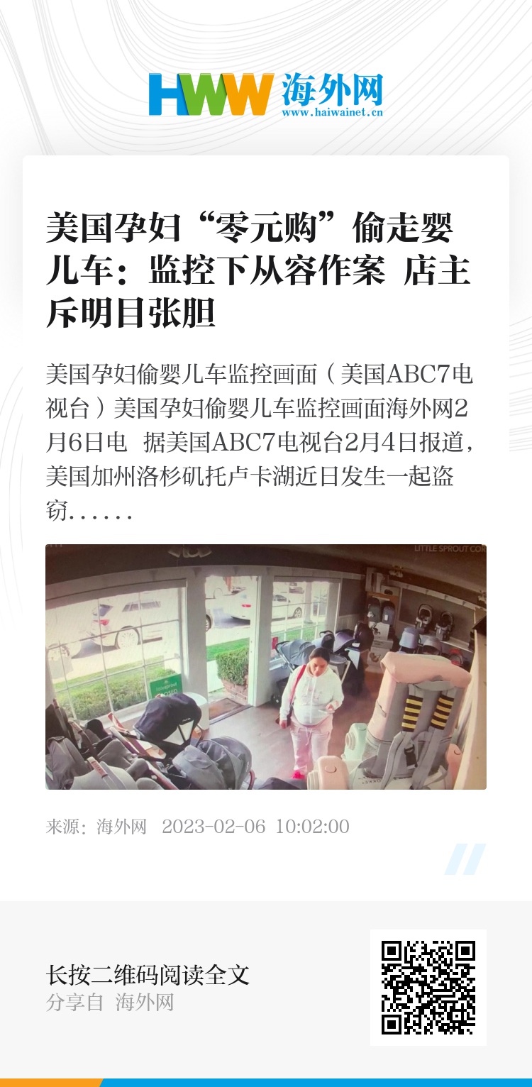海外网2月6日电 据美国ABC7电视台2月4日报道,美国加州洛杉矶托卢卡湖近日发生一起盗窃案,一名孕妇伙同一名男子,光天化日之下从商店偷走一辆昂贵的婴儿车。