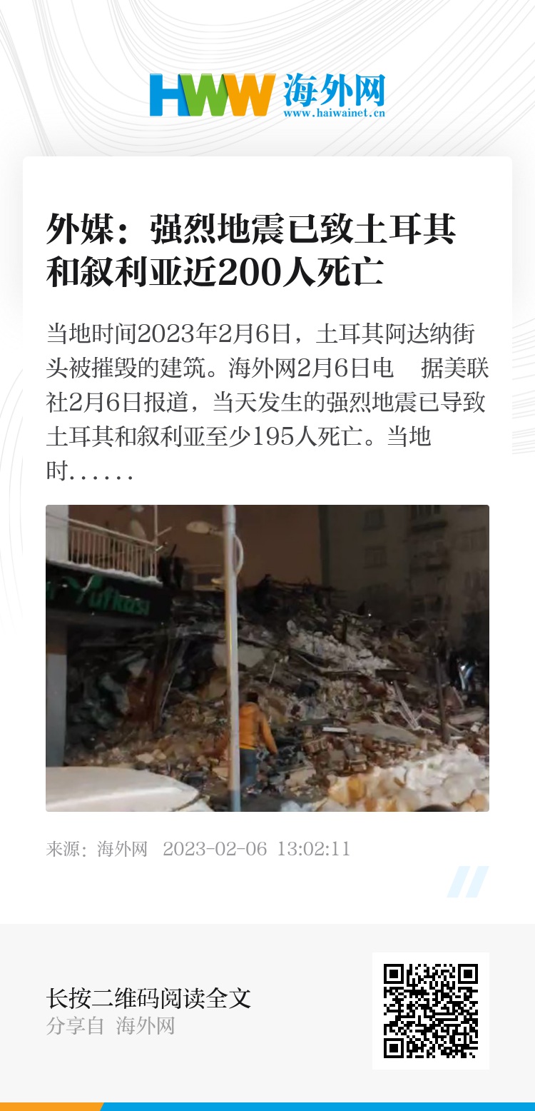 海外网2月6日电 据美联社2月6日报道,当天发生的强烈地震已导致土耳其和叙利亚至少195人死亡。