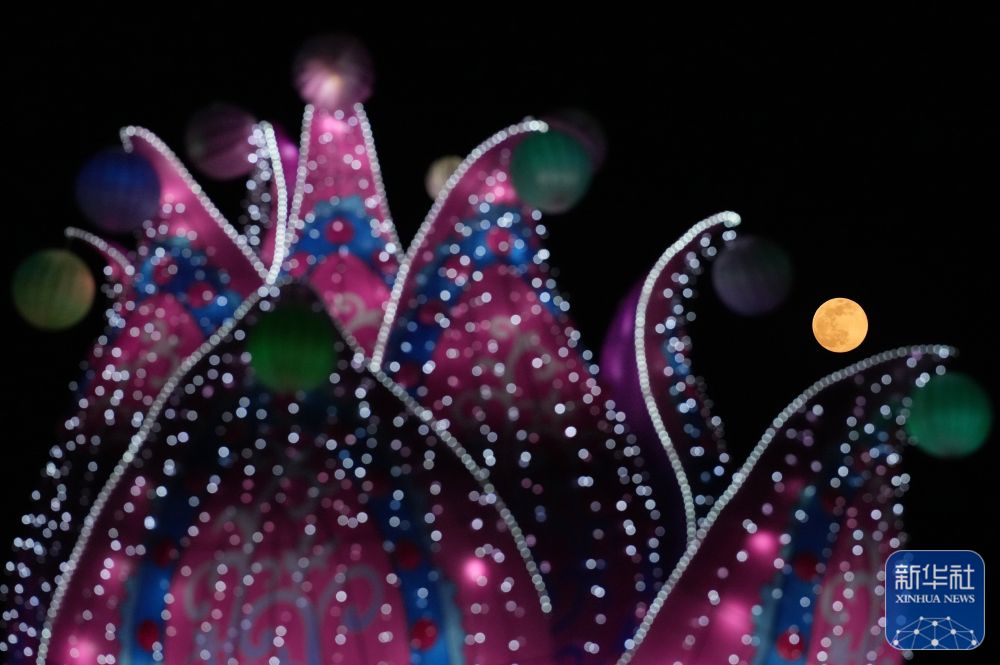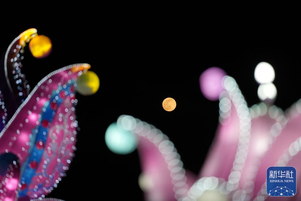 ↑2月5日在北京世园公园拍摄的月亮和花灯。新华社记者 鞠焕宗 摄