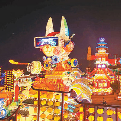 陕西西安城墙灯会,“月中桂兔”灯组绚丽多彩。人民日报记者 原韬雄摄