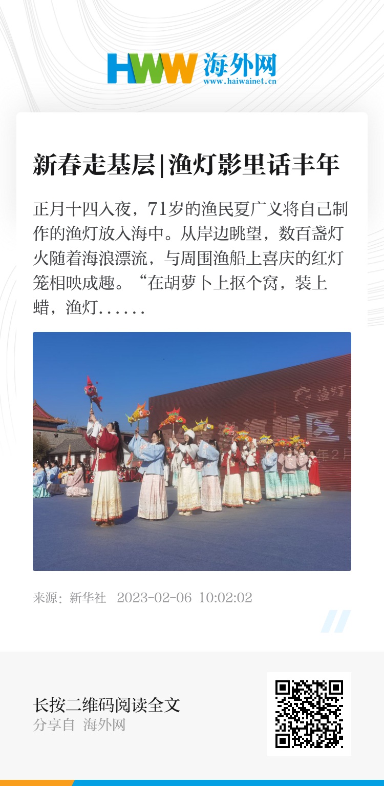 在芦洋村中心大街上,渔灯节祈福巡游开始。全村老少一起来到海边,敲起欢庆锣鼓,舞起渔家秧歌。记者发现,除了传统的放灯、祭海等仪式和秧歌、舞龙等活动外,今年芦洋村还迎来了许多来自四面八方的客人,大家载歌载舞,共同表演渔家号子、水斗等精彩节目。