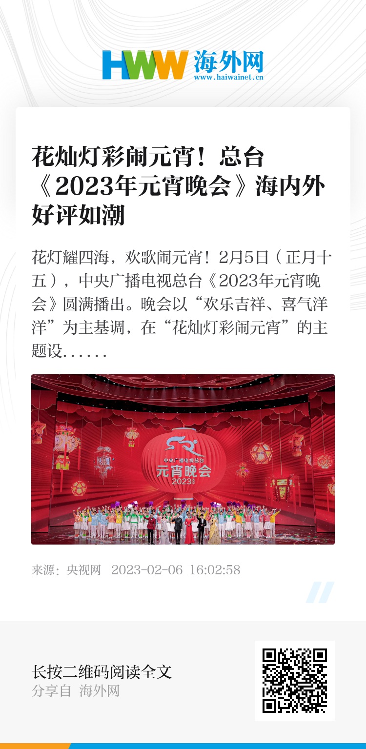 全球媒体齐关注。CGTN(中国国际电视台)英西法阿俄全平台发布元宵晚会相关报道超1092条,获全球阅读量超1.32亿。其中,面向海外重点推介元宵晚会上《声声慢》《新花好月圆夜》《百凤朝阳》《我心万里晴》《威风霓裳》《弈》等歌舞、杂技、乐器演奏、艺术体操等节目,生动展示非遗等中国传统文化和赏花灯等元宵佳节风俗;发布特稿《中央广播电视总台〈2023年元宵晚会〉:花灯耀四海》,获法国《创业》媒体集团、阿尔及利亚《独立青年报》、智利合作电台官网、《俄罗斯报》官网、哈萨克斯坦国家经济周报《哈萨克斯坦实业报》等媒体广泛转载转引;国际视频通讯社向全球媒体推送元宵晚会18条精品节目内容、多语种稿件46篇,被意大利广播电视公司、墨西哥ADN 40电视台、黎巴嫩广场电视台、迪拜电视台、印度国家电视台、文莱国家广播电视台等13个国家和地区的17个电视台及其新媒体平台播发。