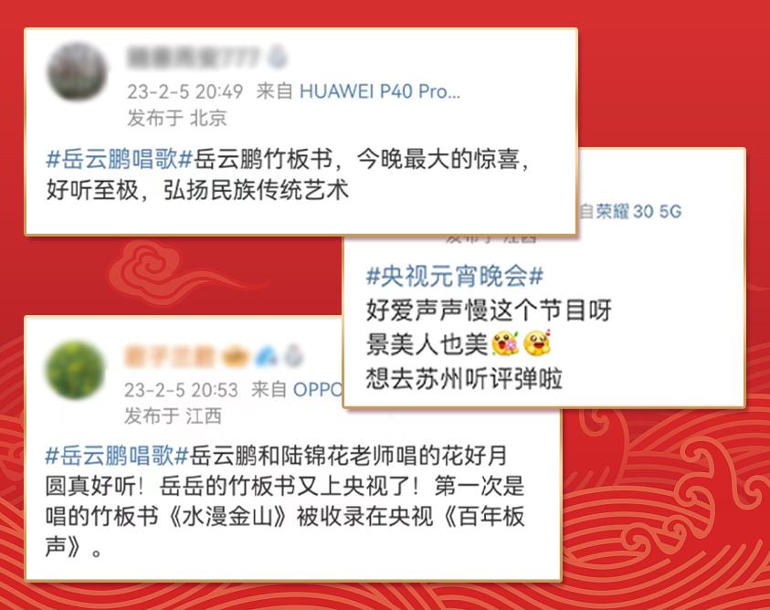 据统计,截至2月6日8时,总台《2023年元宵晚会》跨媒体直播总触达人次3.32亿次,新媒体端直播播放量1.76亿次,电视端直播观众触达人次1.56亿次。元宵节当晚,晚会收视率实现断层夺冠,最高收视超6.3%。晚会贡献全网146个热搜话题,相关阅读量累计超7.5亿。许多网友评论道:“没想到小小的花灯竟然蕴藏着深厚的历史背景”“传统文化设计巧妙、韵味十足”“足不出户赏花灯,像是天南地北的朋友们一起度过这个团圆的夜晚”。