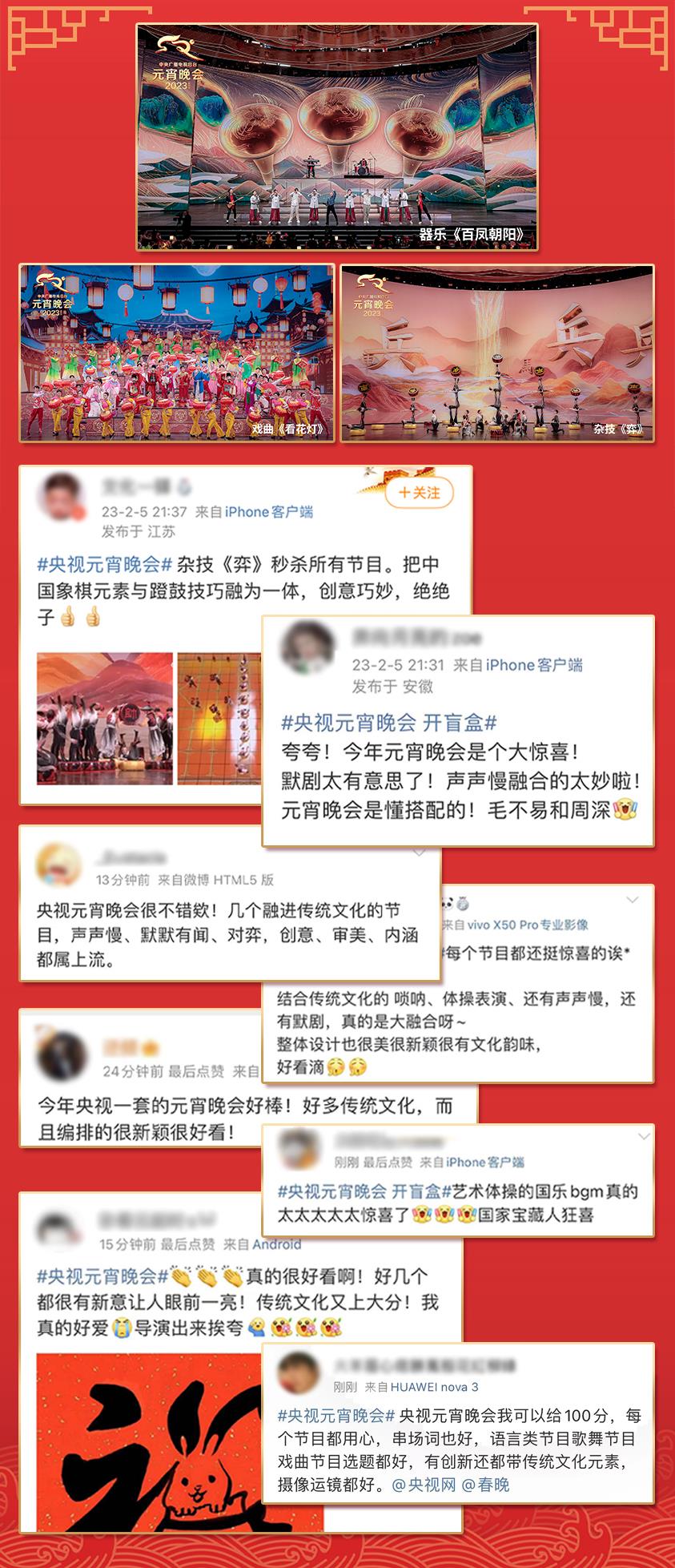 今年元宵晚会用别具一格的匠心设计和精心编排奉上了高潮迭起的精品文化大餐,时代感、年轻化的创新呈现,让许多受众特别是年轻网友直呼近2个小时的节目充满拆盲盒的惊喜感,晚会收视率持续断层走高。多个国家队的出现展示了来自“顶流”的非凡实力,直播中不断有网友在社交平台留言:“今年元宵晚会是个大惊喜”“个个都是隐藏款!”