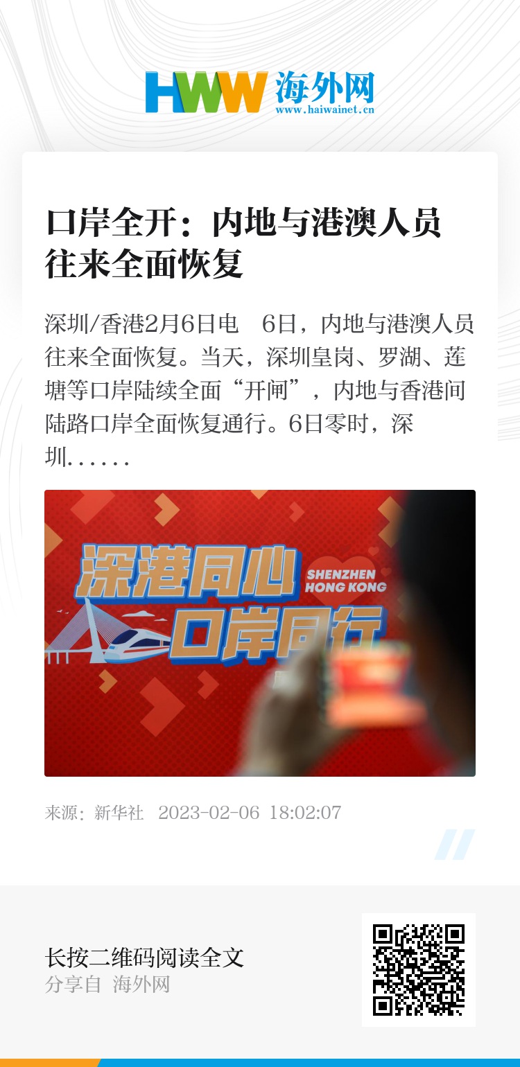 新华社深圳/香港2月6日电 6日,内地与港澳人员往来全面恢复。当天,深圳皇岗、罗湖、莲塘等口岸陆续全面“开闸”,内地与香港间陆路口岸全面恢复通行。