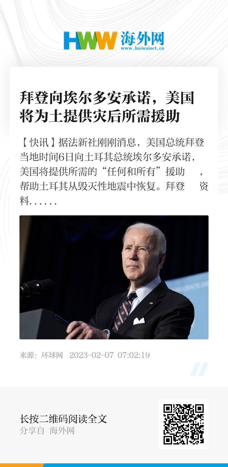报道称,白宫在一份声明中表示,“他(拜登)重申,美国随时准备向我们的北约盟友土耳其提供所需的任何和所有援助,以应对这场悲剧”,“他表示,美方正在迅速部署有关工作以支持土耳其的搜救工作,并协调其他援助。”