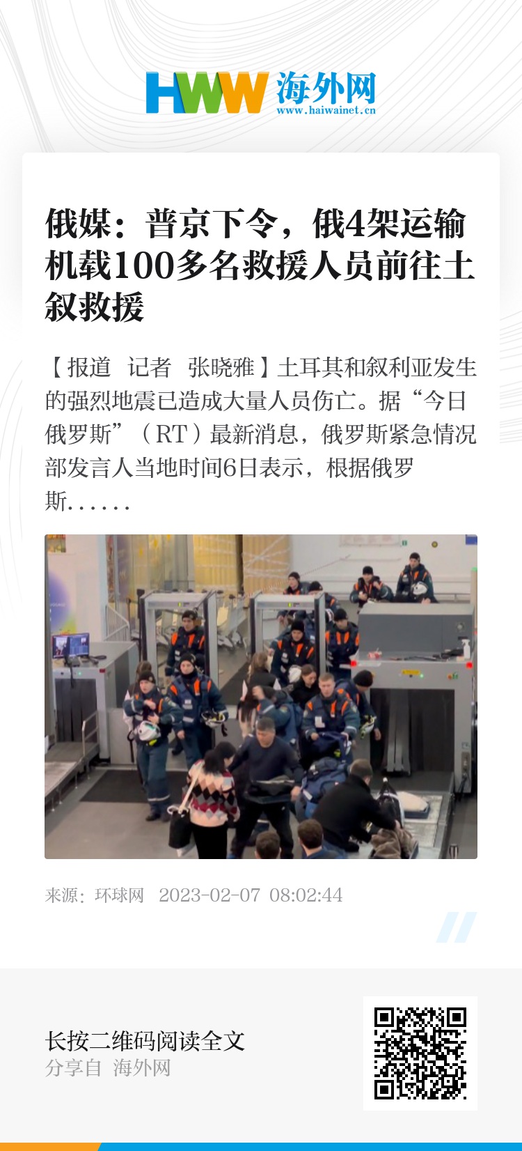 RT称,俄罗斯紧急情况部发言人罗曼·奥霍坚科具体介绍称,俄方派遣团队包括7支搜救犬队和一个由40名医务人员组成的“空中机动医院”,能够在现场提供“合格的医疗援助”,且所有被派往土耳其和叙利亚的专家都获得了执行搜救任务所需的必要设备。