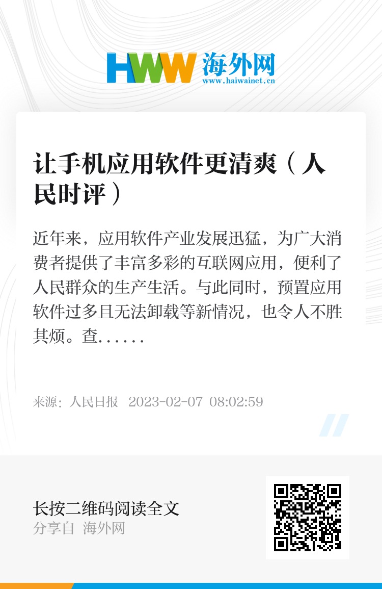 近年来,应用软件产业发展迅猛,为广大消费者提供了丰富多彩的互联网应用,便利了人民群众的生产生活。与此同时,预置应用软件过多且无法卸载等新情况,也令人不胜其烦。查看一下手机等移动智能终端,一般都有好几款预置应用软件,多的可能会超过10款。这些预置应用软件大多功能比较弱,占用内存空间,容易导致手机运行减慢,消耗待机时间,其中有一些还强行推送广告、窃取个人信息,不仅影响用户使用体验,更潜藏着侵害用户权益的风险。无论从保护用户合法权益,还是从清朗信息消费环境来看,规范终端预置应用软件势在必行。
