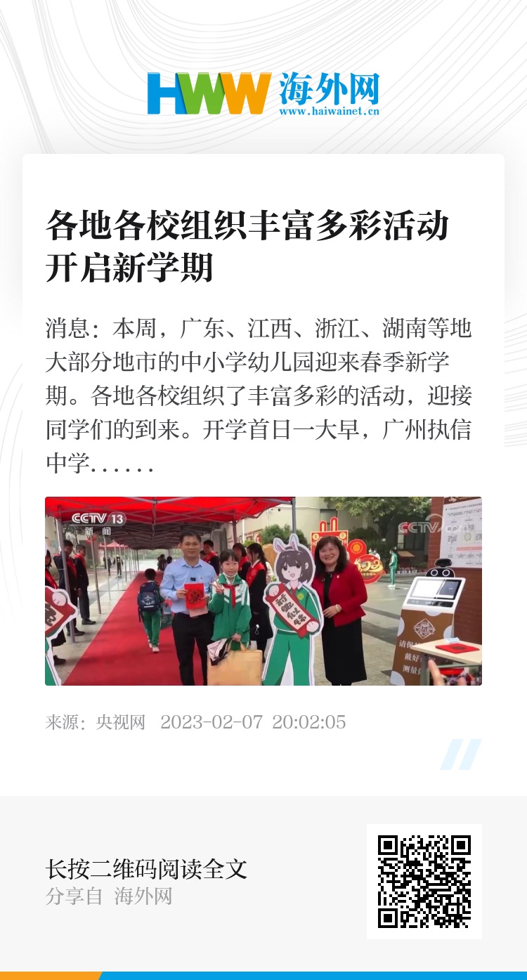 央视网消息:本周,广东、江西、浙江、湖南等地大部分地市的中小学幼儿园迎来春季新学期。各地各校组织了丰富多彩的活动,迎接同学们的到来。