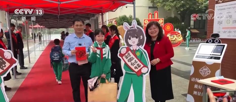 开学首日一大早,广州执信中学琶洲实验学校的老师们就在校门口为同学们送上新学期礼物,带有新春祝福的木版年画。学校还专门设置了入门打卡点,为每位同学拍下新学期第一张打卡照。