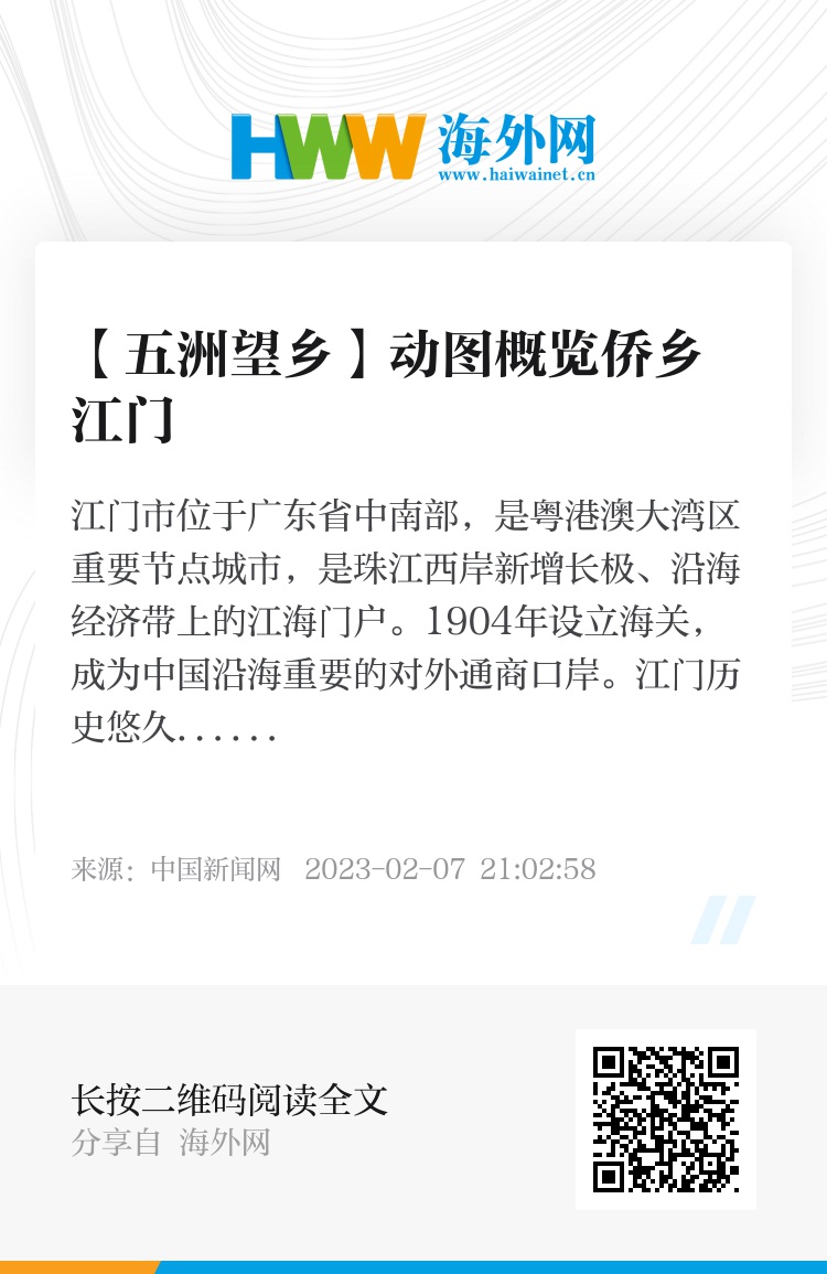 江门市位于广东省中南部,是粤港澳大湾区重要节点城市,是珠江西岸新增长极、沿海经济带上的江海门户。1904年设立海关,成为中国沿海重要的对外通商口岸。