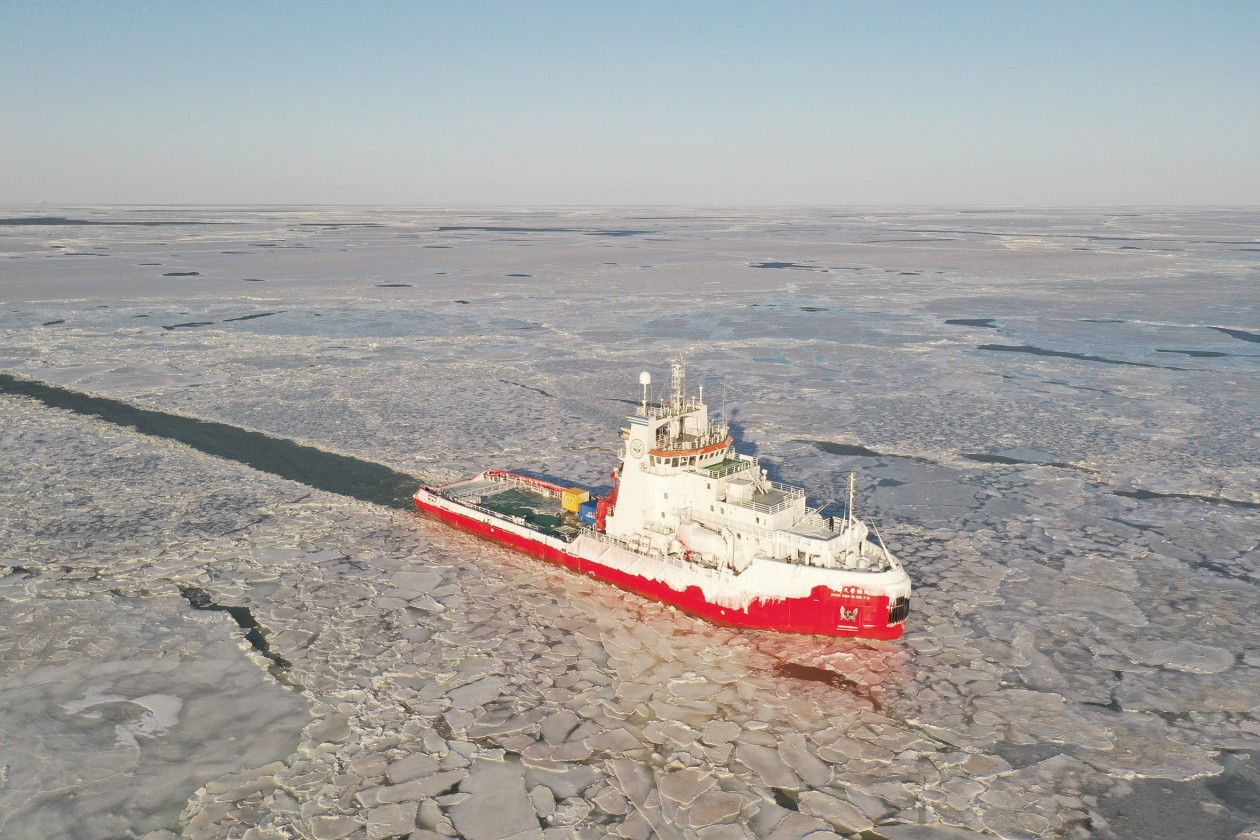 “中山大学极地”号破冰船在渤海冰区试航。(中山大学)