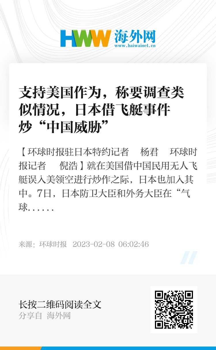 日本政府官员日前还表示,该国国内也曾出现类似“气球”,并启动相关调查。据日本广播协会(NHK)网站6日报道,日本内阁官房副长官矶崎仁彦当天表示:“政府知晓,2020年6月和2021年9月我国上空曾被目击有飞行物体,我们将继续分析这是否与此次在美国发生的事情有关联性等。”