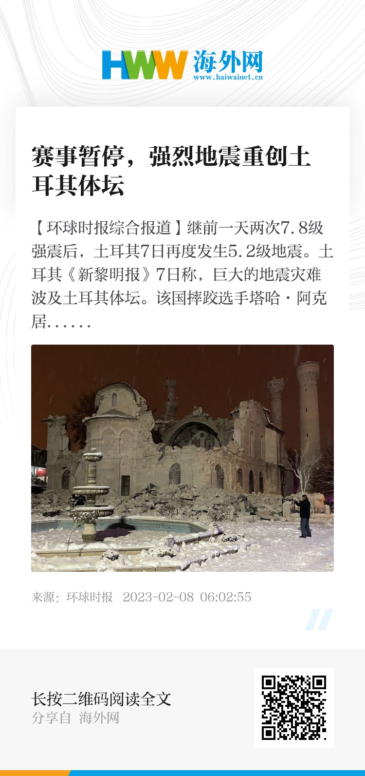 【环球时报综合报道】继前一天两次7.8级强震后,土耳其7日再度发生5.2级地震。土耳其《新黎明报》7日称,巨大的地震灾难波及土耳其体坛。该国摔跤选手塔哈·阿克居尔6日在社交媒体上称,“我们的运动员在废墟下等待紧急援助。”