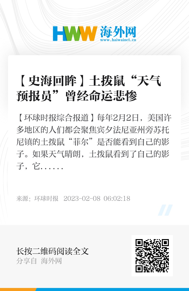 【环球时报综合报道】每年2月2日,美国许多地区的人们都会聚焦宾夕法尼亚州旁苏托尼镇的土拨鼠“菲尔”是否能看到自己的影子。如果天气晴朗,土拨鼠看到了自己的影子,它会回到洞穴里再睡6个星期,这预示着冬天还要持续6周时间;如果当天是阴天,土拨鼠看不到自己的影子,它就会留在洞穴外,这就意味着冬天即将结束、春天很快就要到来了。日前,美国有线电视新闻网以《土拨鼠日的奇异历史》为题介绍了这一有趣的历史传统。