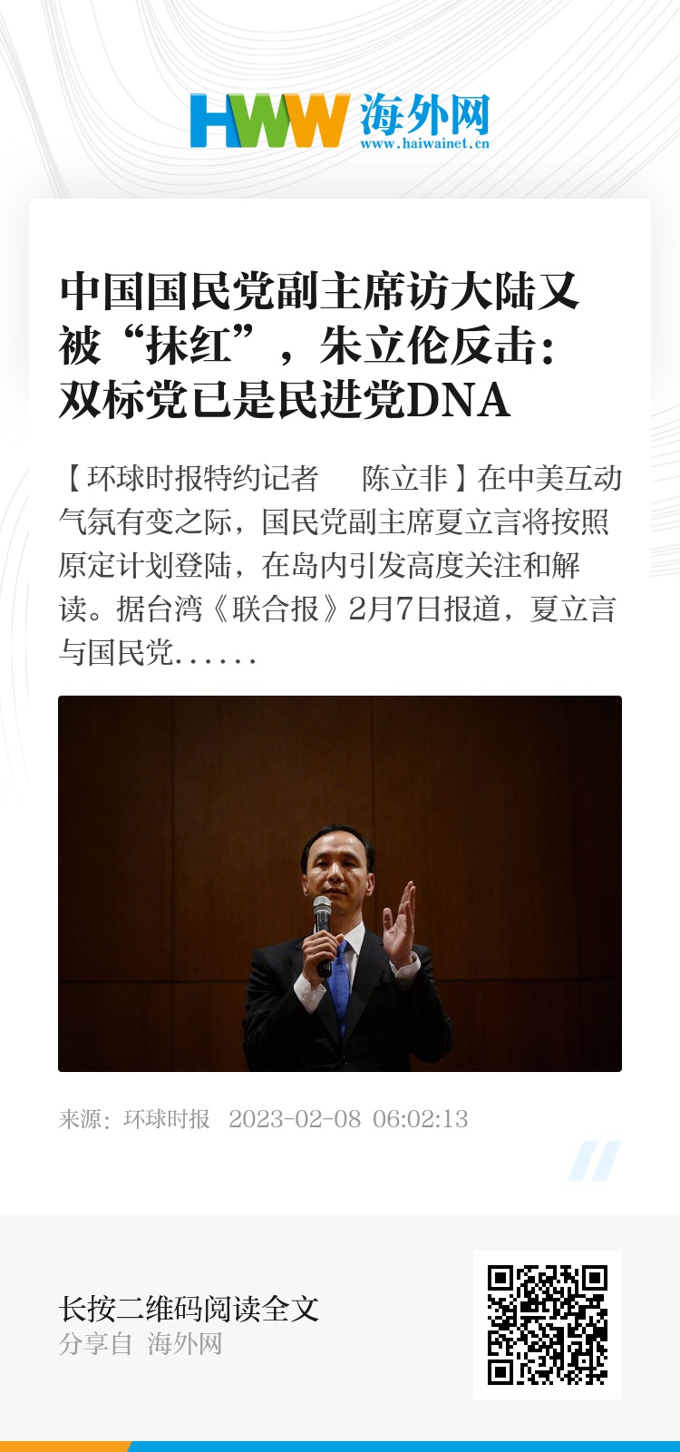 国民党主席朱立伦强调,两岸交流对话,一定要持续进行,“这次夏立言出访,国民党不用害怕,坚持做对的事情”。他以金酒出口大陆为例称,金门县长陈福海、国民党“立委”陈玉珍亲自到大陆,解决金酒输陆的问题,民进党身为执政党不仅不作为,也无能力处理问题,竟然还诬指两人“投共”,民进党想尽办法,只会“抹红”这一招而已。7日朱立伦又质疑称,民进党不是也说希望对话交流吗?结果国民党去做了,他们只会骂、“抹红”、抹黑,不会为台湾民众解决问题,只会制造问题,“双标党已经是民进党DNA(基因)”。