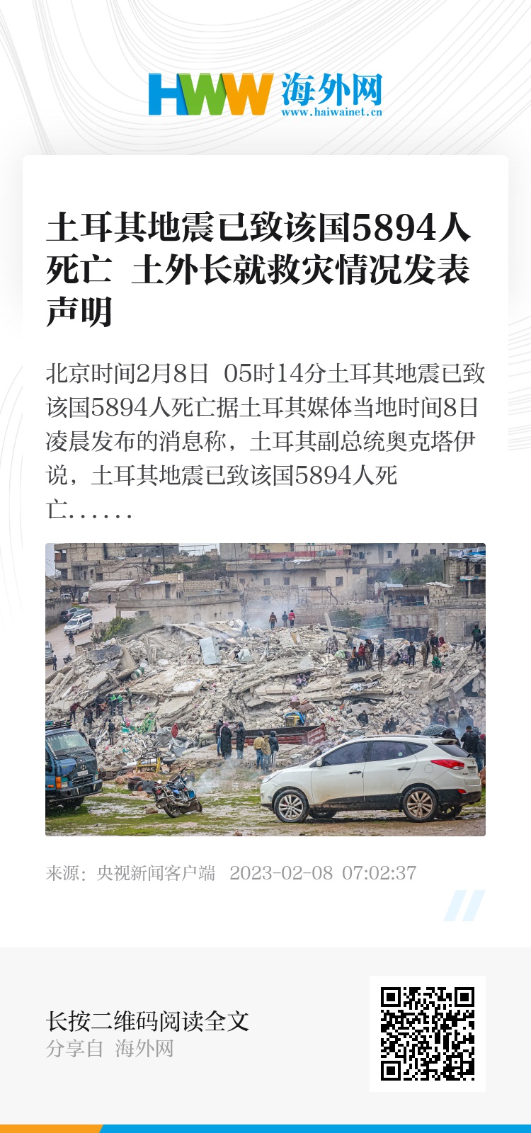 土耳其外长恰武什奥卢就地震救灾情况发表声明