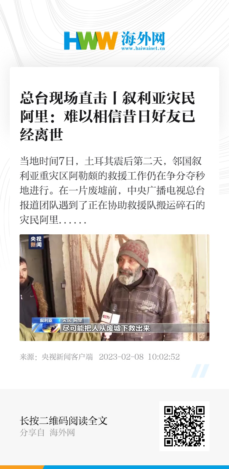 在一片废墟前,中央广播电视总台报道团队遇到了正在协助救援队搬运碎石的灾民阿里。他告诉记者,每搬一块石头,废墟里的人就多一线生还的希望,他要一直在这里坚守。