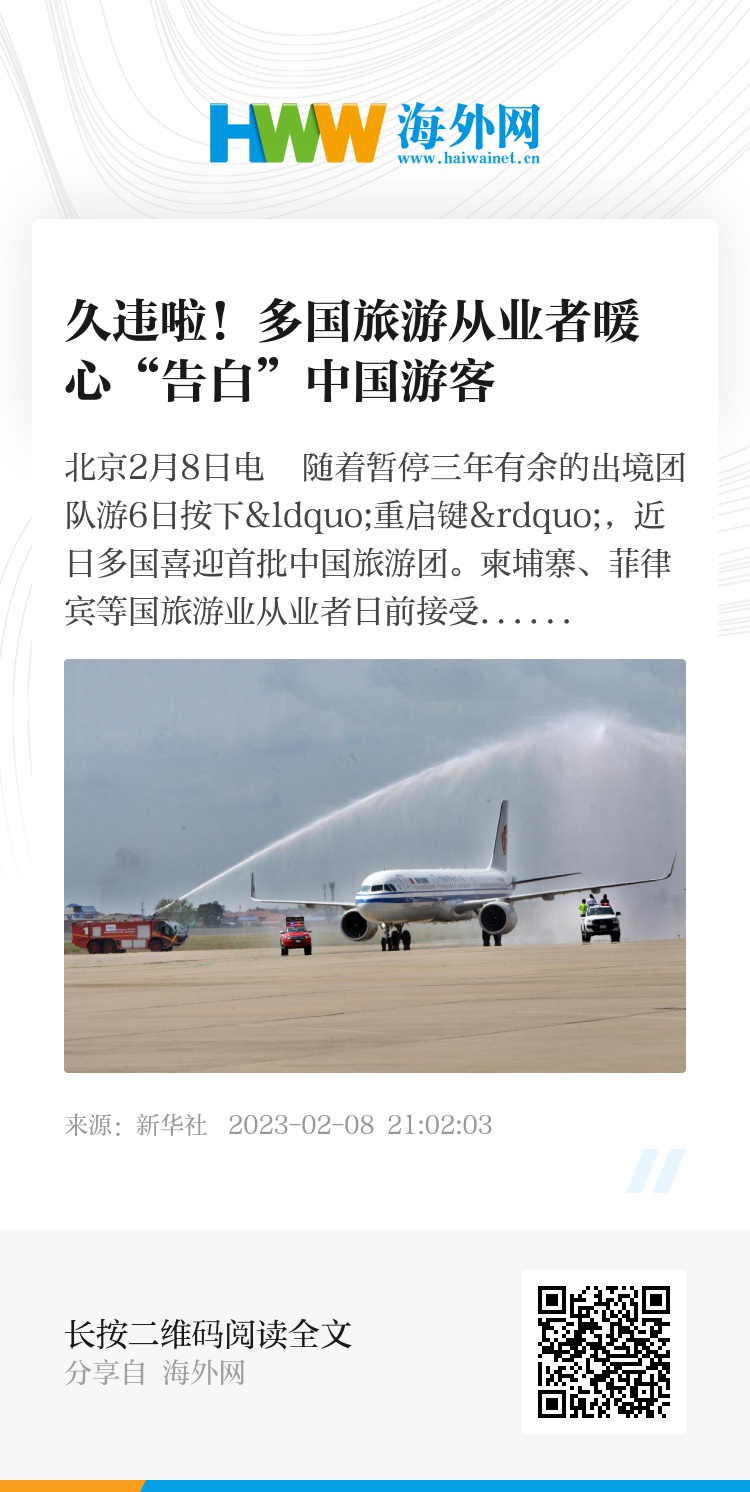 新华社北京2月8日电 随着暂停三年有余的出境团队游6日按下“重启键”,近日多国喜迎首批中国旅游团。柬埔寨、菲律宾等国旅游业从业者日前接受新华社记者采访时,纷纷表达对中国游客的热烈欢迎和对旅游市场复苏的信心。