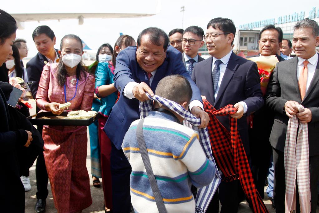 飞机停稳后,等待乘客们的是两排欢迎人群。伴随热情的柬埔寨传统舞蹈昌扬舞,柬埔寨旅游大臣童昆和中国驻柬埔寨大使王文天向中国客人逐一送上柬埔寨传统水布和花环,给予他们热烈欢迎和诚挚祝福。
