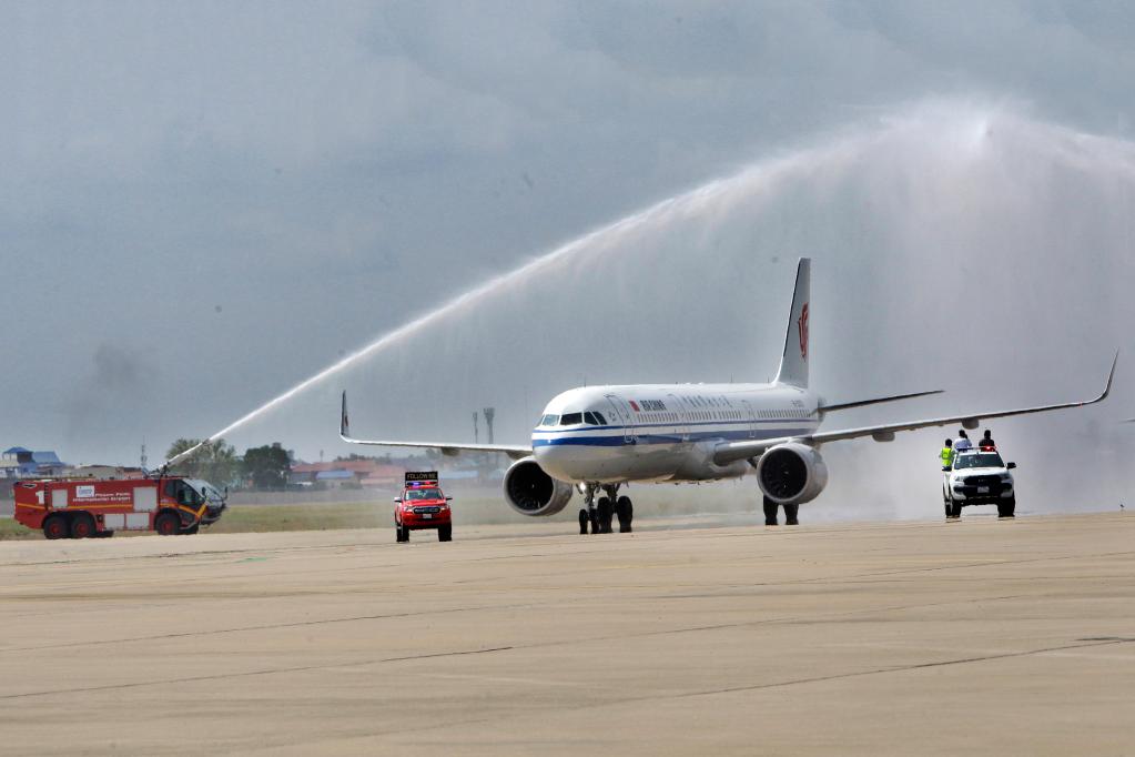 2月7日中午,一架载有125名乘客的中国国航航班在柬埔寨首都金边国际机场徐徐穿过水门。飞机“过水门”仪式极具象征意义,寓意给来客“接风洗尘”,属国际民航中最高规格礼遇。