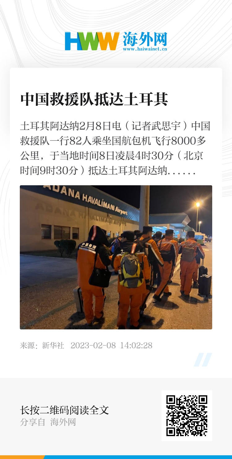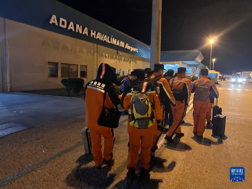 2月8日,中国救援队抵达土耳其阿达纳机场(手机拍摄)。新华社记者 武思宇 摄