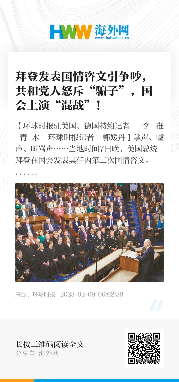 【环球时报驻美国、德国特约记者 李 准 青 木 环球时报记者 郭媛丹】掌声、嘘声、叫骂声……当地时间7日晚,美国总统拜登在国会发表其任内第二次国情咨文。他在演讲中一边极力展示自己任职两年来所取得的成绩,一边批评共和党人阻挠他的经济议程,遭到在座的共和党议员愤怒回击,“现场爆发混乱”。许多媒体注意到,外交政策不是拜登此次国情咨文的重点,但他还是在演讲中多次提到中国。拜登重申他所谓“寻求与中国竞争、而非冲突”的说法,称为了美国的利益会与中国合作,但“如果中国威胁到我们的主权,我们将采取行动”。对此,中国外交部发言人毛宁8日表示,中方一向认为,中美关系不是你输我赢、你兴我衰的零和博弈,中美各自取得成功对彼此是机遇而不是挑战。宽广的地球完全容得下中美各自发展、共同繁荣。“中方不回避也不惧怕竞争,但反对以竞争来定义整个中美关系。打着竞争旗号,对一国进行污蔑抹黑,限制别国正当发展权利,甚至不惜损害全球产业链供应链,这不是一个负责任国家的所为。”