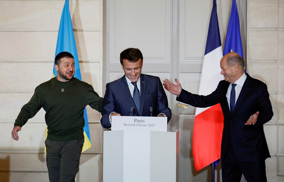 法国巴黎,泽连斯基、马克龙、朔尔茨(左起)举行联合新闻发布会