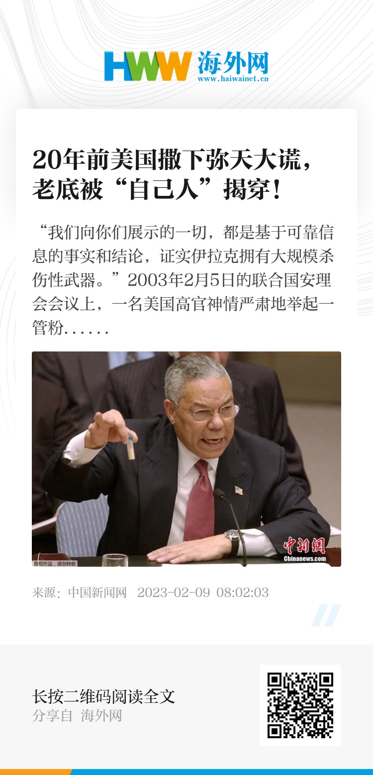 可见这些年来,美国的招数没怎么变,还是熟悉的配方,熟悉的味道。但鲍威尔手举试管的画面,已被记入历史,成为“谎言帝国”永远无法抹去的污点。(中新网首席国际记者:孟湘君)