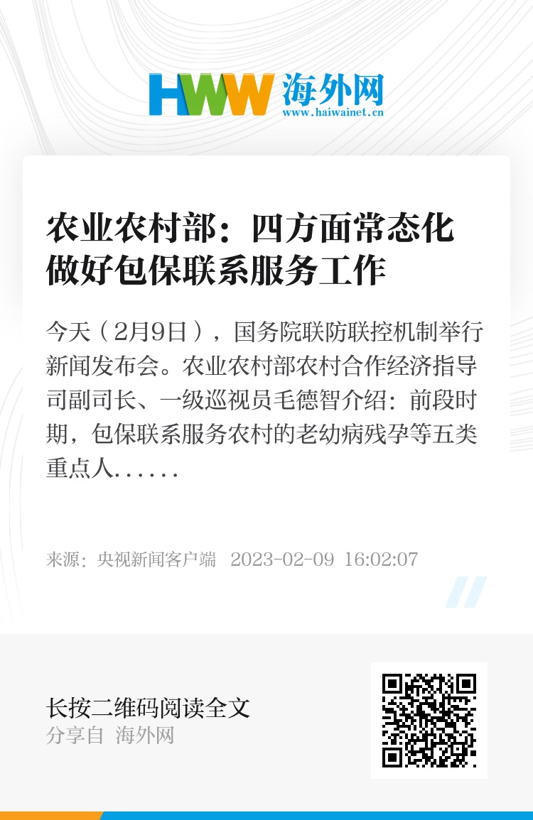 今天(2月9日),国务院联防联控机制举行新闻发布会。农业农村部农村合作经济指导司副司长、一级巡视员毛德智介绍:前段时期,包保联系服务农村的老幼病残孕等五类重点人群,起到了“早发现、早识别、早干预、早转诊”的关口前移的作用。下一步,在统筹疫情防控和农业生产各项工作时,仍然要高度关注农村这些重点人群,来常态化地做好包保联系的服务工作。主要是四个方面: