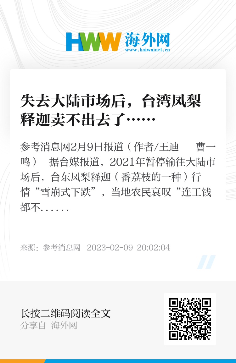 参考消息网2月9日报道(作者/王迪 曹一鸣) 据台媒报道,2021年暂停输往大陆市场后,台东凤梨释迦(番荔枝的一种)行情“雪崩式下跌”,当地农民哀叹“连工钱都不够”,甚至传出释迦要被当局收购“当肥料”的消息。当地民代称,岛内消费者难以消化如此大的量,希望当局设法和对岸交涉,打通大陆市场才是务实且长远的助农之计。