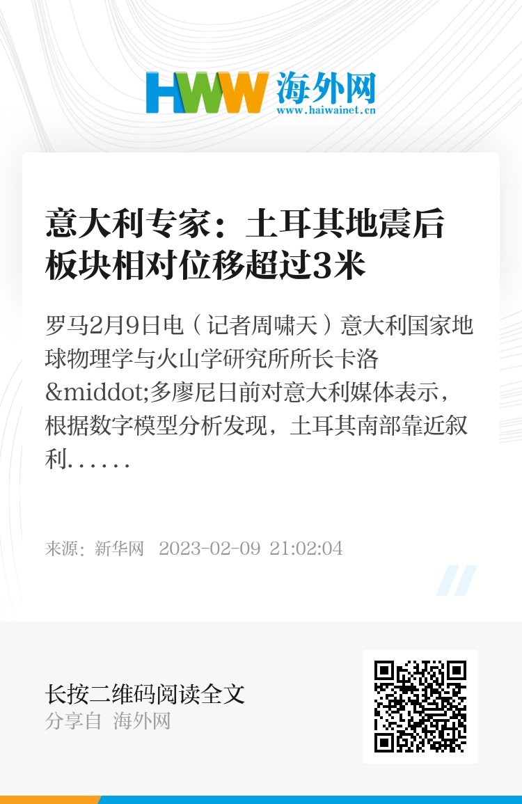 新华社罗马2月9日电(记者周啸天)意大利国家地球物理学与火山学研究所所长卡洛·多廖尼日前对意大利媒体表示,根据数字模型分析发现,土耳其南部靠近叙利亚边境地区发生强烈地震后,叙利亚所在的阿拉伯板块相对土耳其大部分国土所在的安纳托利亚板块位移超过3米。