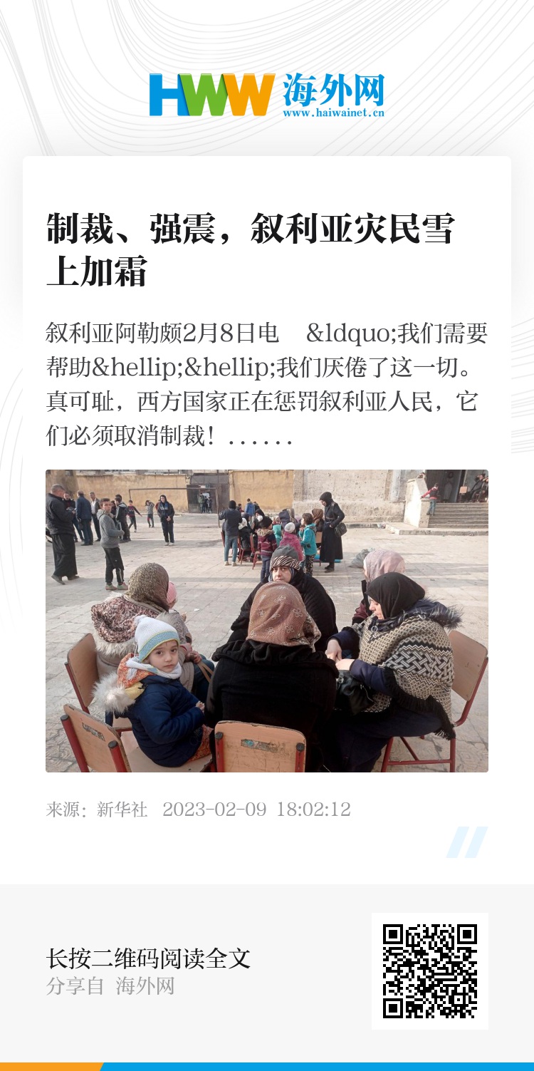 新华社叙利亚阿勒颇2月8日电 “我们需要帮助……我们厌倦了这一切。真可耻,西方国家正在惩罚叙利亚人民,它们必须取消制裁!”在位于叙利亚北部地震灾区的阿勒颇市,公立学校教师艾莎·希卢7日向新华社记者控诉道。