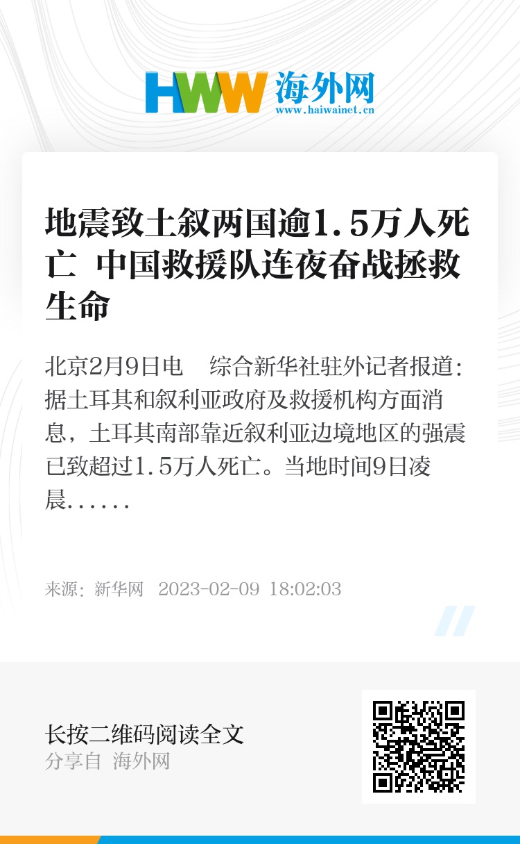 新华社北京2月9日电 综合新华社驻外记者报道:据土耳其和叙利亚政府及救援机构方面消息,土耳其南部靠近叙利亚边境地区的强震已致超过1.5万人死亡。当地时间9日凌晨,中国救援队与当地救援队通力合作,成功救出一名孕妇。