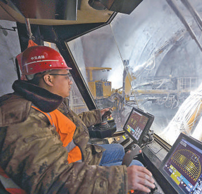 首都地区环线高速公路承德至平谷段杨家窝铺特长隧道施工现场,工人在操作机械进行钻孔。