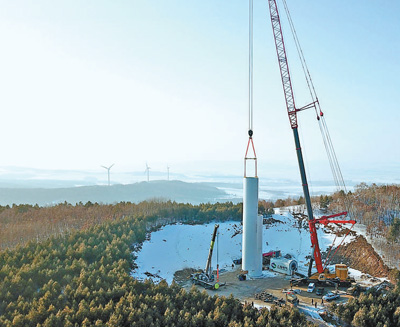 华电黑龙江区域哈尔滨依兰鸡冠山风电场三期工程风电机组吊装现场。