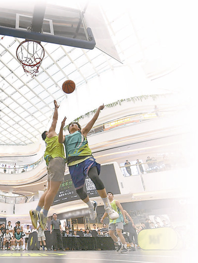 2022年7月9日,一场三人篮球比赛在湖南长沙一商场举行,球员积极攻防。