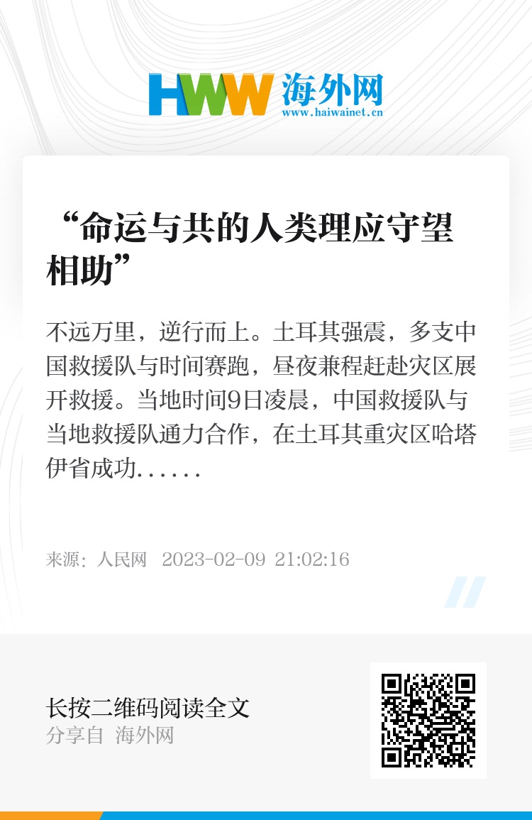 不远万里,逆行而上。土耳其强震,多支中国救援队与时间赛跑,昼夜兼程赶赴灾区展开救援。当地时间9日凌晨,中国救援队与当地救援队通力合作,在土耳其重灾区哈塔伊省成功从一栋8层倒塌房屋的废墟中营救出一名孕妇。人民网海外社交媒体发布相关报道后,各国网友纷纷留言。“这就是国际救援行动应有的样子”“所有国家应该在灾难面前团结起来。”“人类理应守望相助。”……