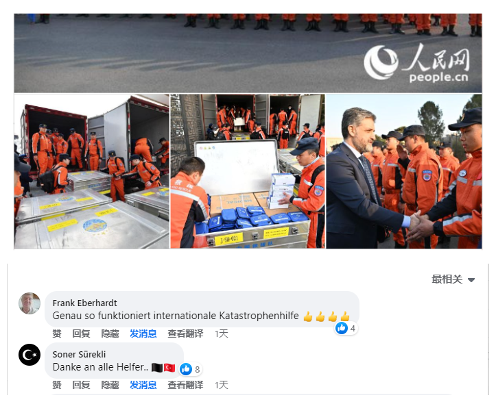 在《中国向土耳其派遣救援队》的帖文下,德国网友Frank Eberhardt表示“这就是国际救援行动应有的样子”,德国网友Soner Sürekli表示“感谢所有伸出援手的人”。