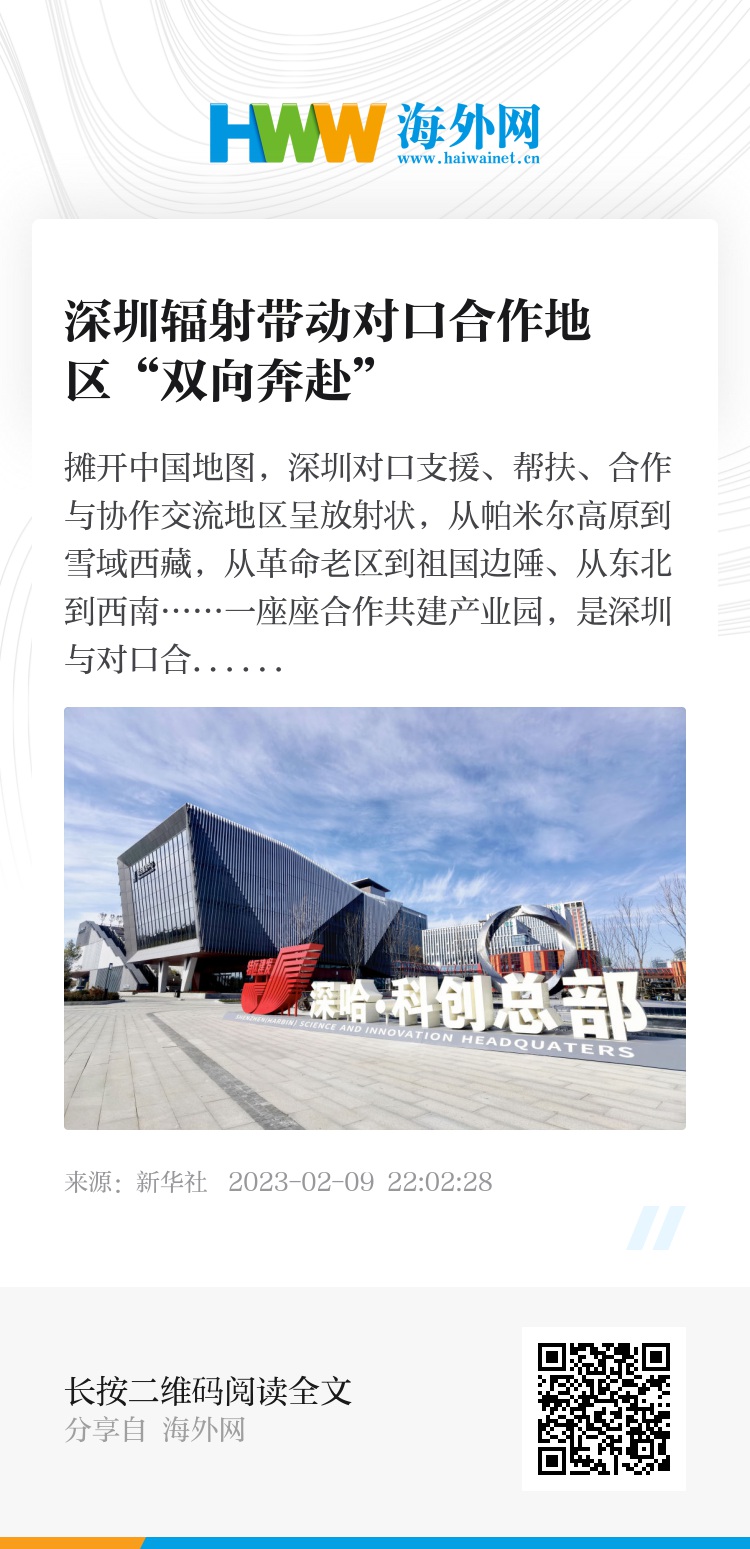 摊开中国地图,深圳对口支援、帮扶、合作与协作交流地区呈放射状,从帕米尔高原到雪域西藏,从革命老区到祖国边陲、从东北到西南……一座座合作共建产业园,是深圳与对口合作地区“双向奔赴”的见证;一座座布满深圳印记的学校、医院,是深圳援建对口帮扶地区的最好注脚。