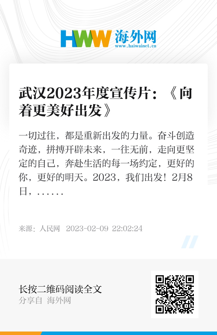2月8日,武汉市委宣传部发布《向着更美好出发》年度宣传片。宣传片回顾了武汉人难忘不易却始终满怀希望的2022年,为2023年的奋斗凝神聚气,加油鼓劲。